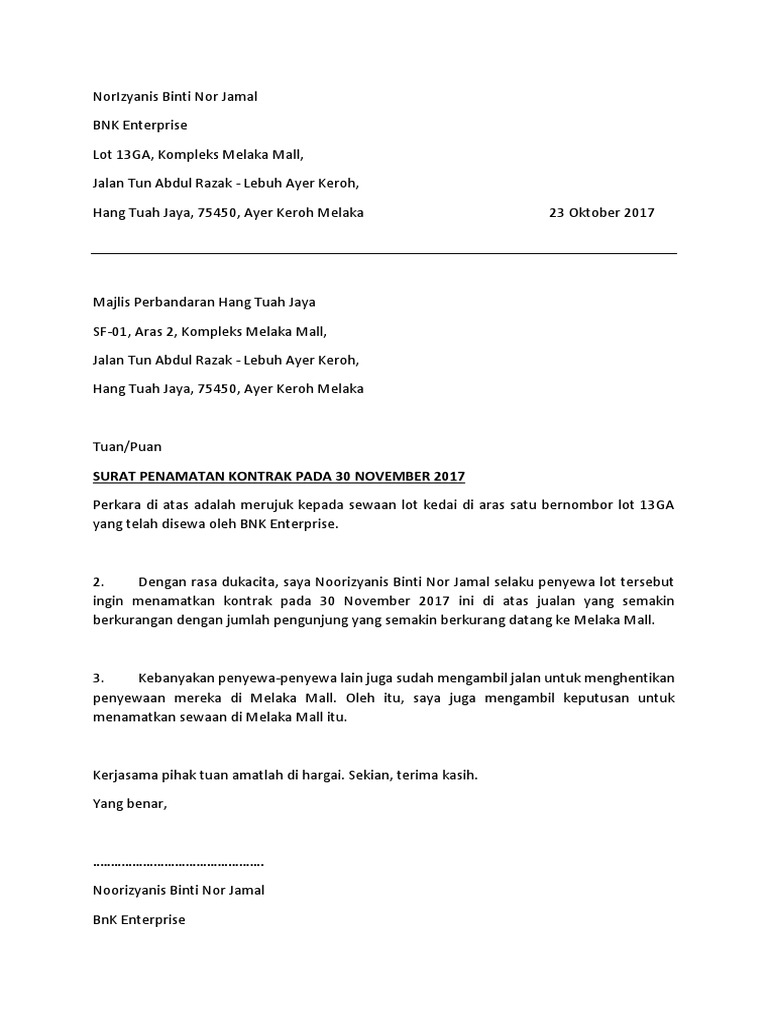 Surat Penamatan Kontrak Bnk Enterprise Pdf